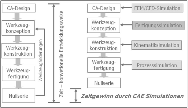 An dieser Stelle muss erläutert werden, dass ohne Einsatz der Tiefziehsimulation, die Schritte Werkzeugkonzeption, -konstruktion, -fertigung und die Nullserienfertigung ein ausgesprochen iterativer Prozess ist. Oftmals wird während der Nullserienfertigung schließlich festgestellt, dass die Produktqualität wegen Fehlern in der Werkzeugkonzeption und -konstruktion nicht ausreicht. Dies muss überarbeitet werden, zudem ist oftmals ein vollständig neues Werkzeug zu fertigen.
